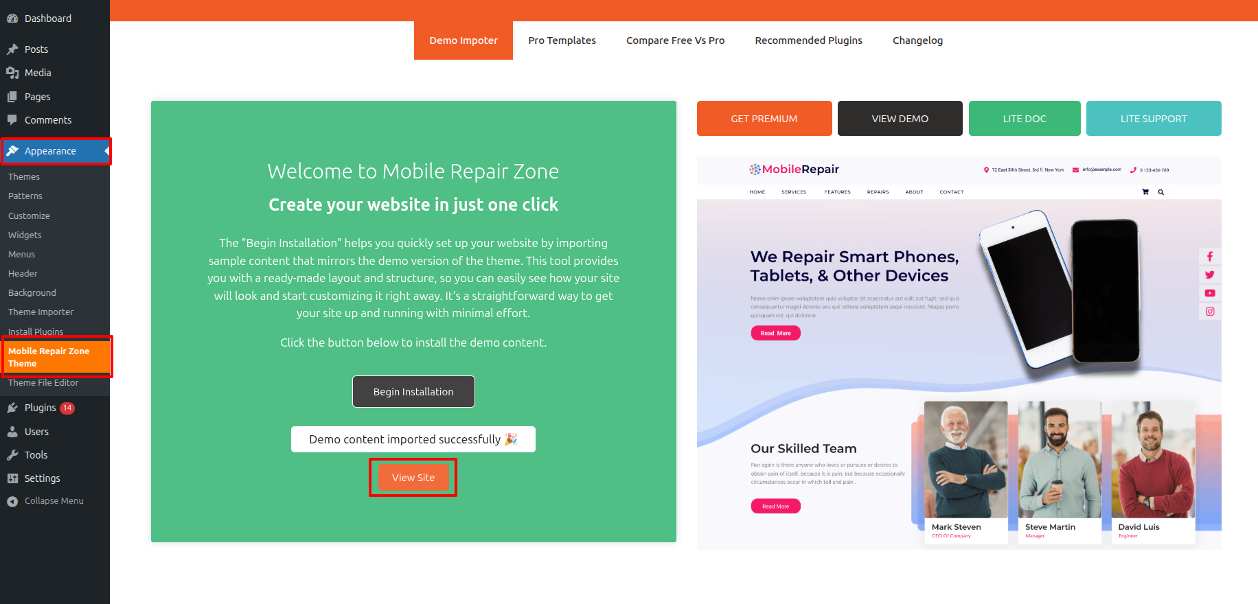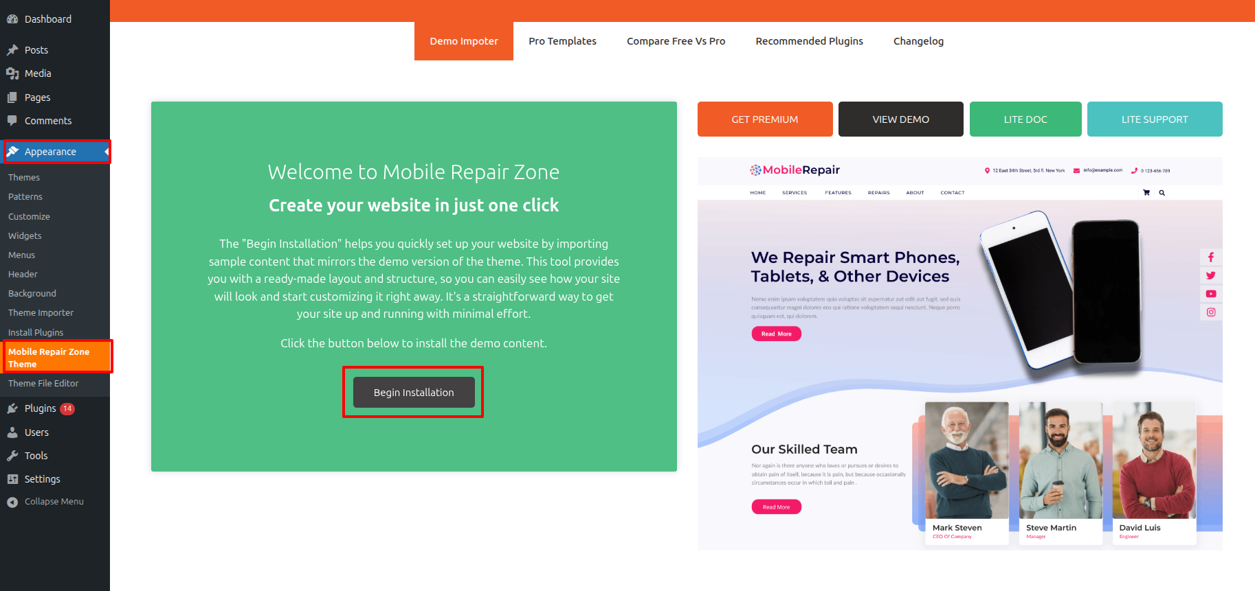 Navigate to Dashboard == Appearance == Mobile Repair Zone Theme = click the Begin Installation